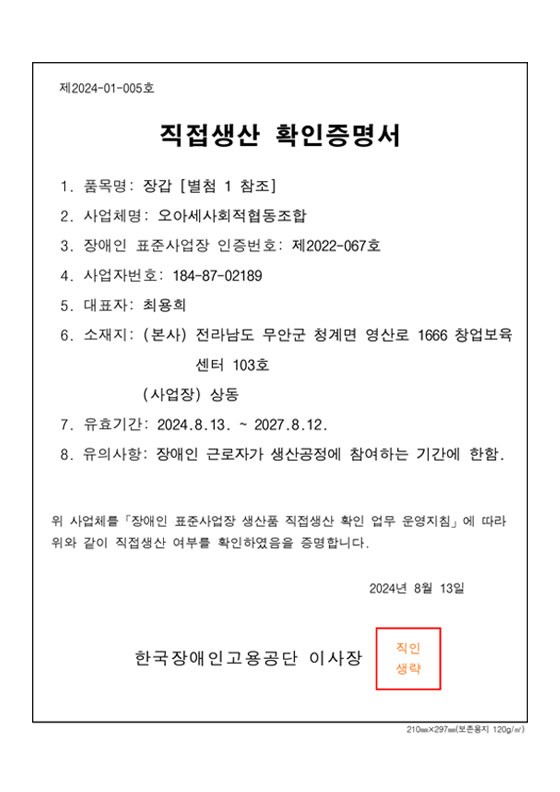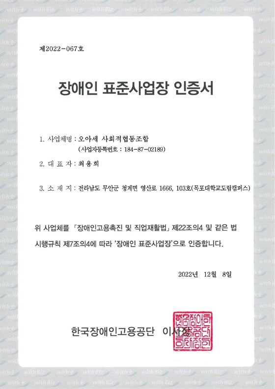 장애인 표준사업장 인증서
